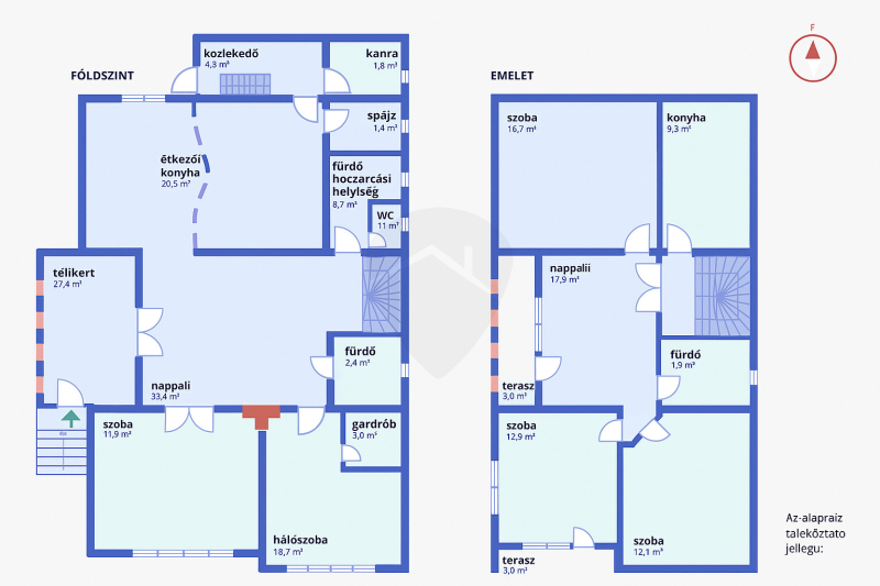 Összesen 5 szoba, tágas nappalik, 3 fürdőszoba, étkező-konyha, kamra, spájz és gardrób