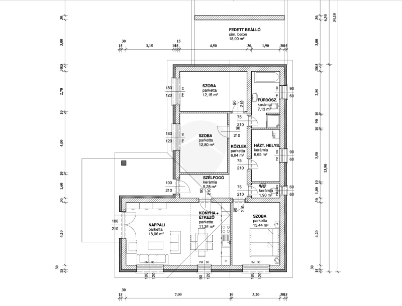 Jól átgondolt, világos, tágas terek jellemzik, 3 hálószoba + amerikai konyhás nappali, WC, fürdőszoba, háztartási helyiség található az ingatlanban.