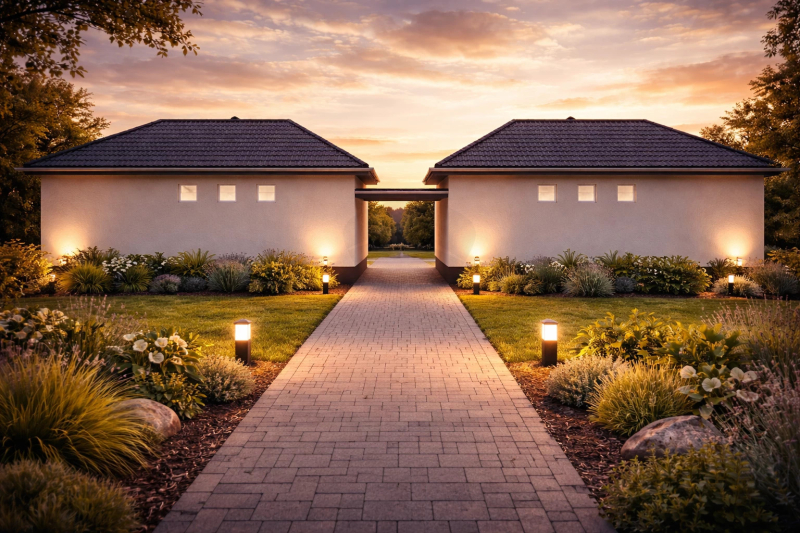 A házakat fedett gépkocsibeállóval kötik össze, így nincs közös fal.